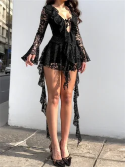 Women Lace Mini Dress Flared Long Sleeve V Neck Irregular Ruffle A-line Mini Dress Summer Fall Sexy Elegant Sundress