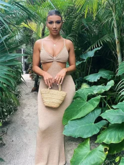 Women Summer Long Dress Sleeveless V Neck Hollow Out Bodycon Dress Bohemian Sexy Club Beach Dresses Y2K Aesthetic Clothes